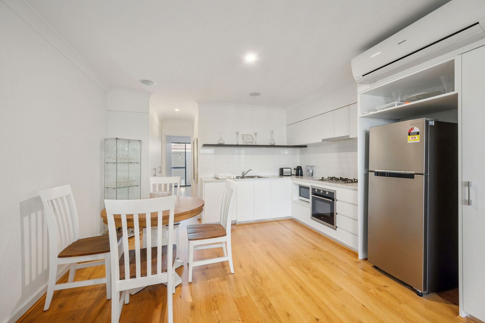 Open-plan kitchen with gas cooktop and ample storage