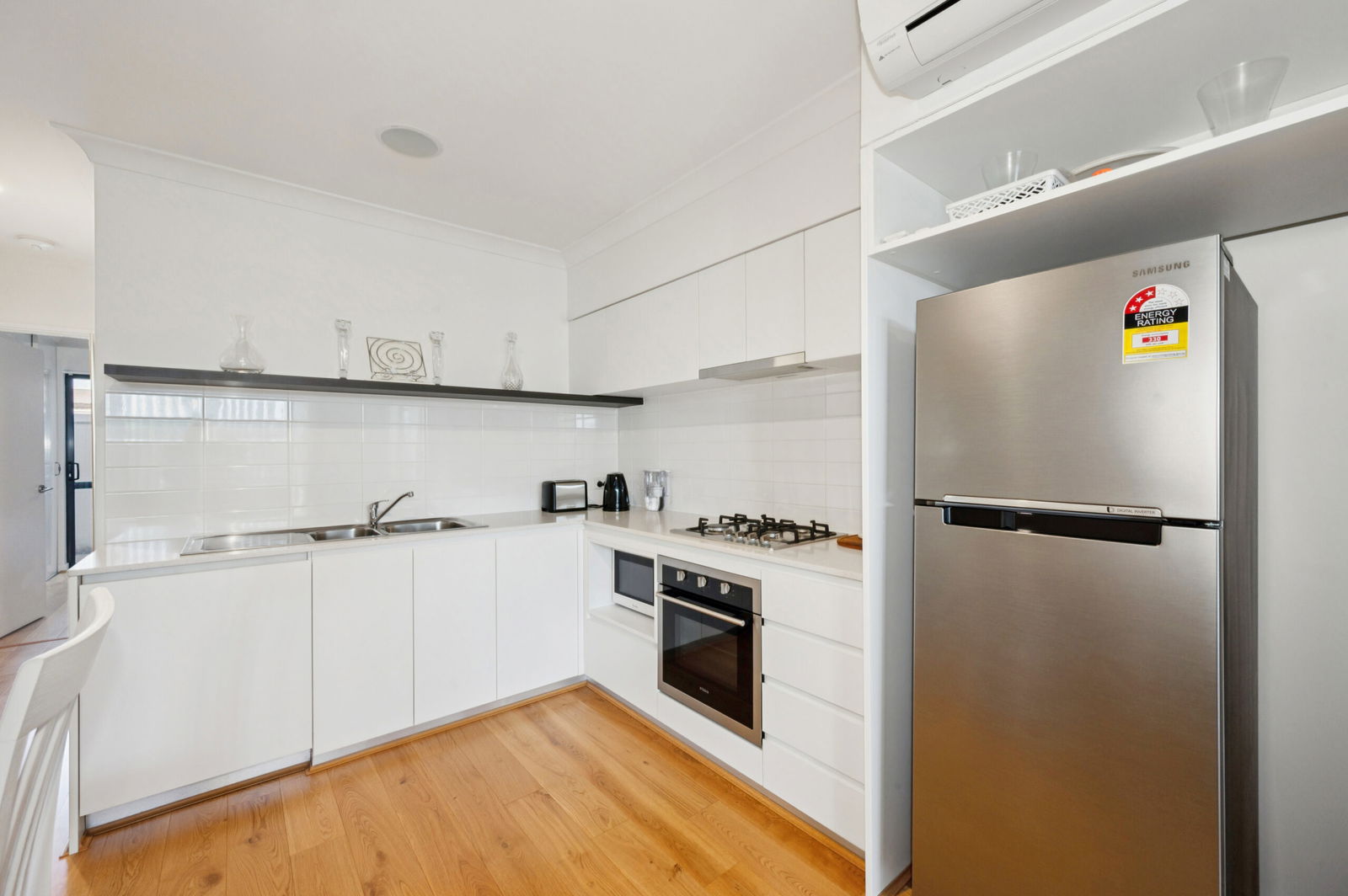 The apartment features attractive hardwood flooring throughout, creating a modern and welcoming feel. The open-plan kitchen is well equipped with a gas cooktop and ample storage, seamlessly flowing into the main living area to create a functional and inviting space. The living area is fitted with split-system air conditioning, ensuring year-round comfort.