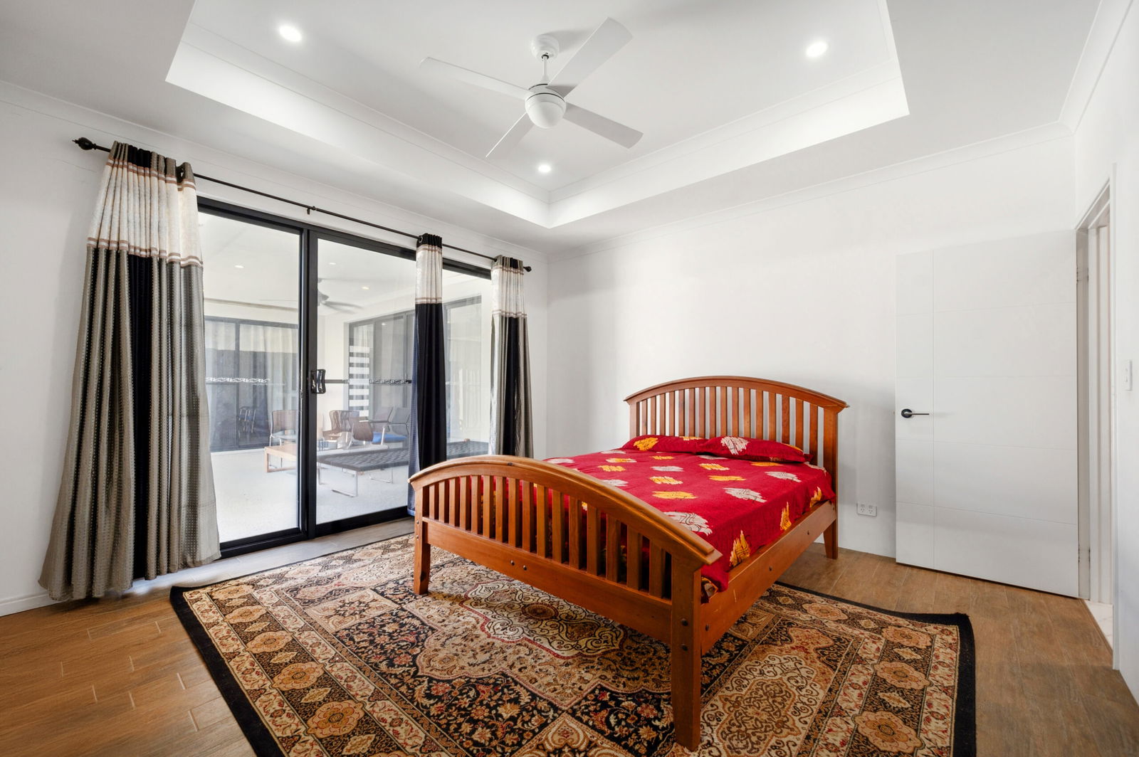 Accommodation is equally impressive. The luxurious master suite features high ceilings with a suspended design, ceiling fan, a spacious walk-in robe, and a beautifully appointed ensuite with a separate toilet. Bedroom two enjoys its own private ensuite and walk-in robe, making it ideal for guests or extended family. Bedrooms three and four are well sized, each with built-in robes and ceiling fans, while a stylish family bathroom with stone benchtops and bathtub services the home alongside a convenient powder room.