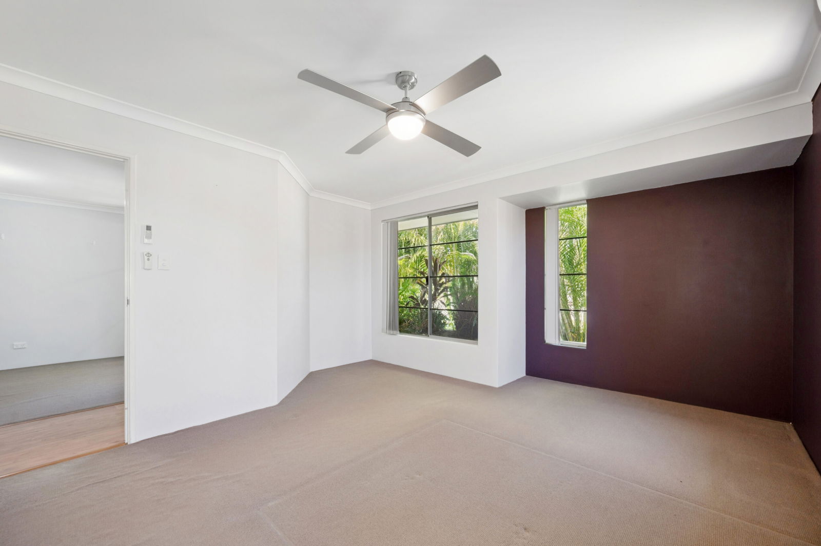 The master suite serves as a peaceful retreat, featuring soft carpet underfoot, a ceiling fan, split system air conditioning, and the added luxury of dual walk-in wardrobes – ideal for a practical “his and hers” setup.