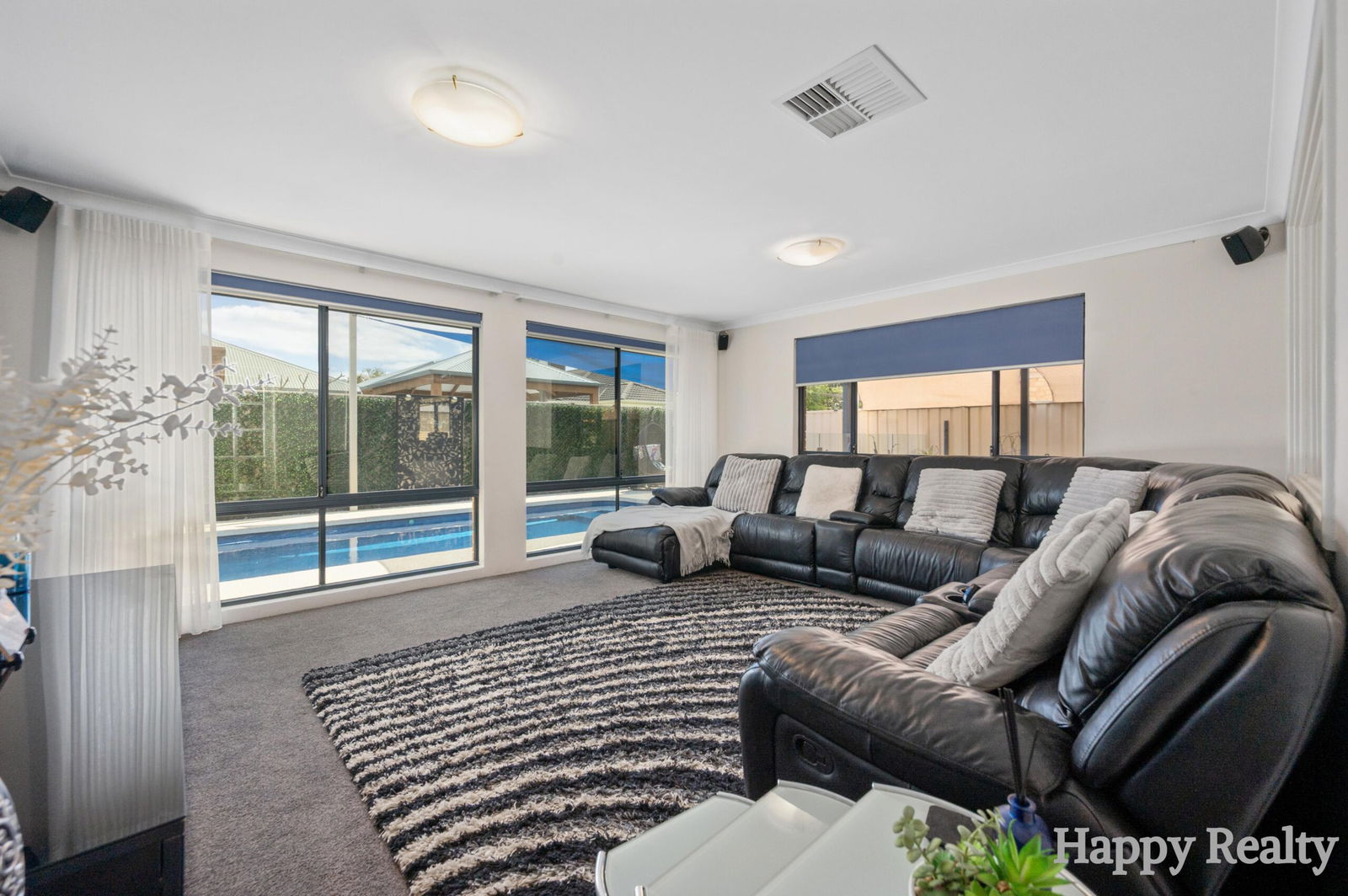 The heart of the home is the open-plan chef’s kitchen, dining, and family living area, enhanced by soaring 34-course ceilings. The kitchen is beautifully renovated with stainless steel appliances, a large walk-in larder, ceramic cooktop, microwave recess, and plenty of storage space. Flowing from here is a massive dining area, a family/activity room enclosed with views across the pool, and a theatre room that’s perfect for entertaining.