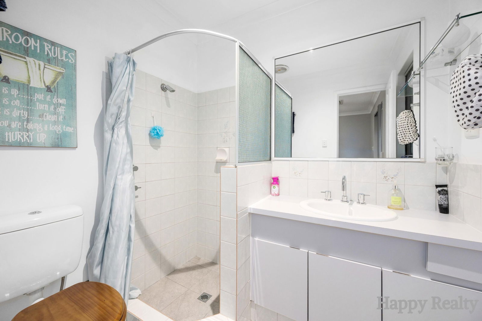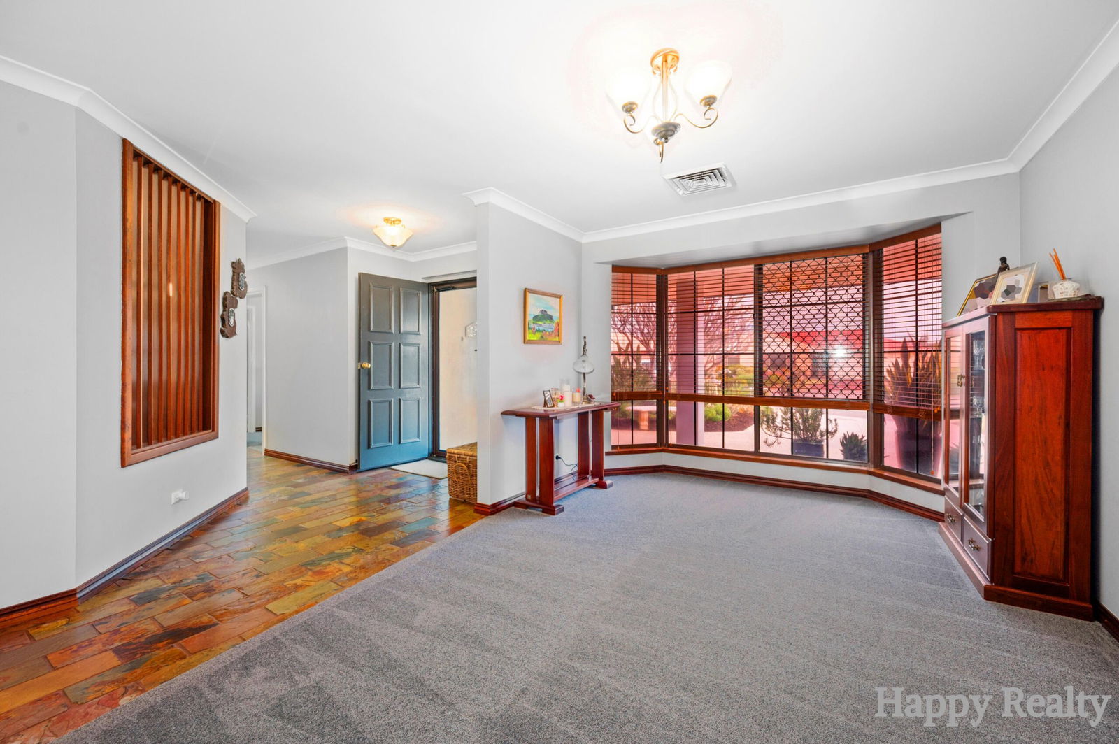 The heart of the home is the open-plan family zone, finished with warm Jarrah flooring and overlooked by a designer kitchen featuring granite benchtops, ample cabinetry, and modern appliances. Skylights bathe the dining and living areas in natural light, while ceiling fans and reverse-cycle air conditioning ensure comfort year-round.